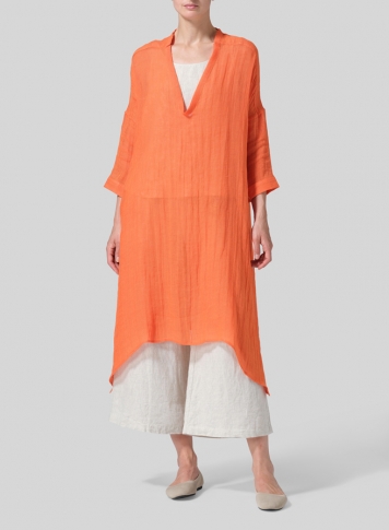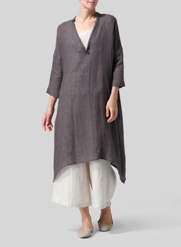 Woven Linen Roll Sleeve Deep V-neck Tunic